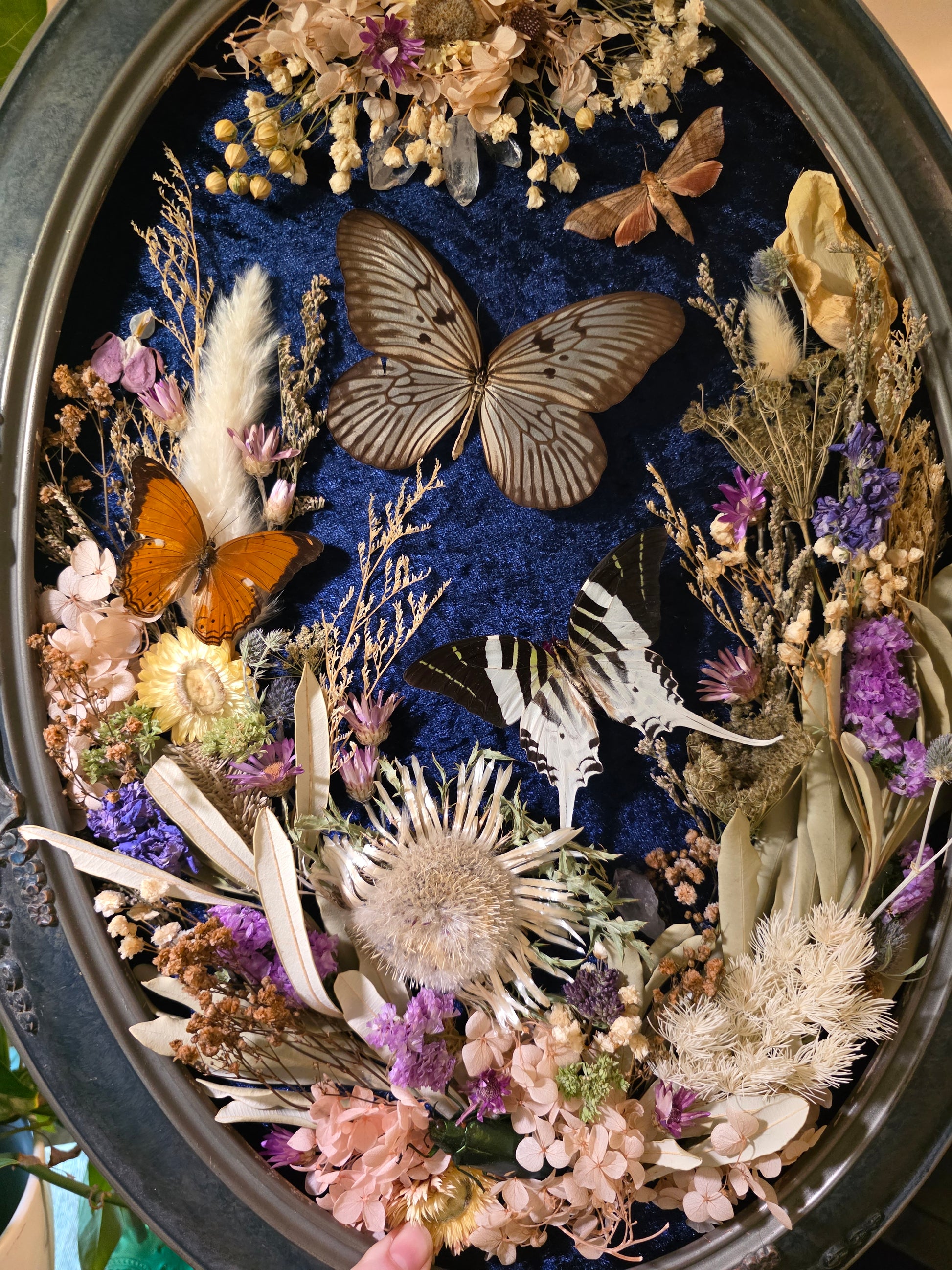 This whimsical frame houses three butterflies surrounded by dried flowers, crystals, and a little moth.