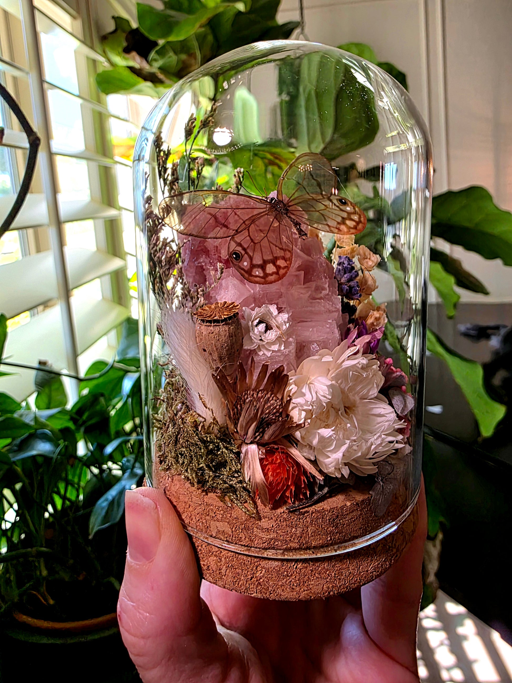 This stunning glass and cork terrarium houses a Glass Wing Butterfly mounted on pink halite and surrounded by real dried flowers.