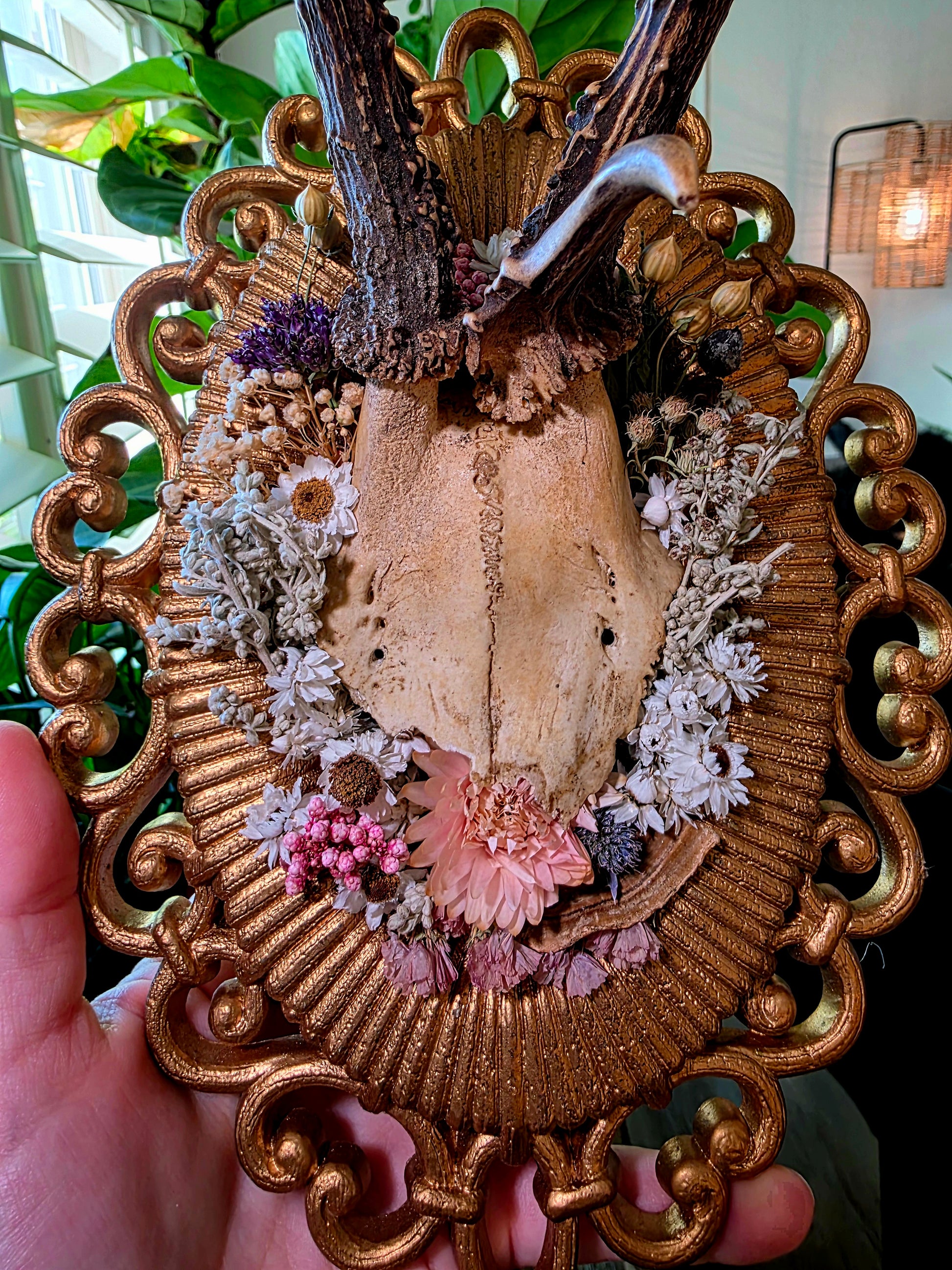 Real Roe deer skull piece with antlers mounted on a vintage frame and surrounded by real flowers.