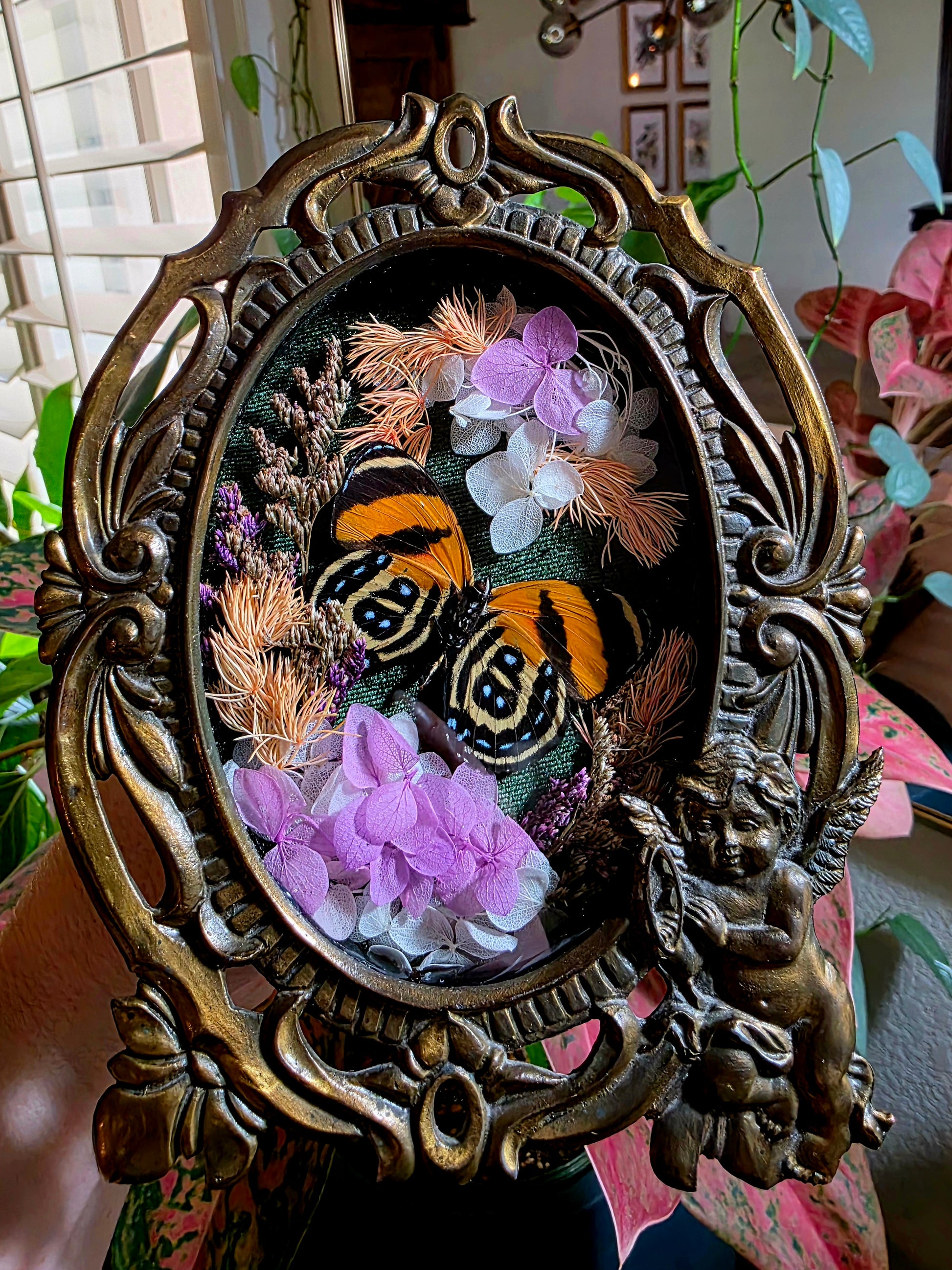 This adorable ornate brass frame featuring a cherub houses a real butterfly and dried flowers.